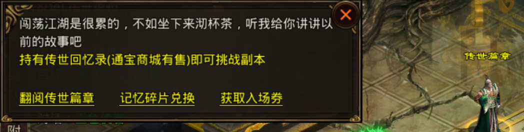 玄仙以上的勇士完成系列任务便可开启传世篇章,消耗传世回忆录(通宝商城限量出售),可从梦魇大厅挑战副本。挑战胜利后可获得记忆碎片,使用记忆碎片可兑换重生特戒、稀有时装等各类材料。
