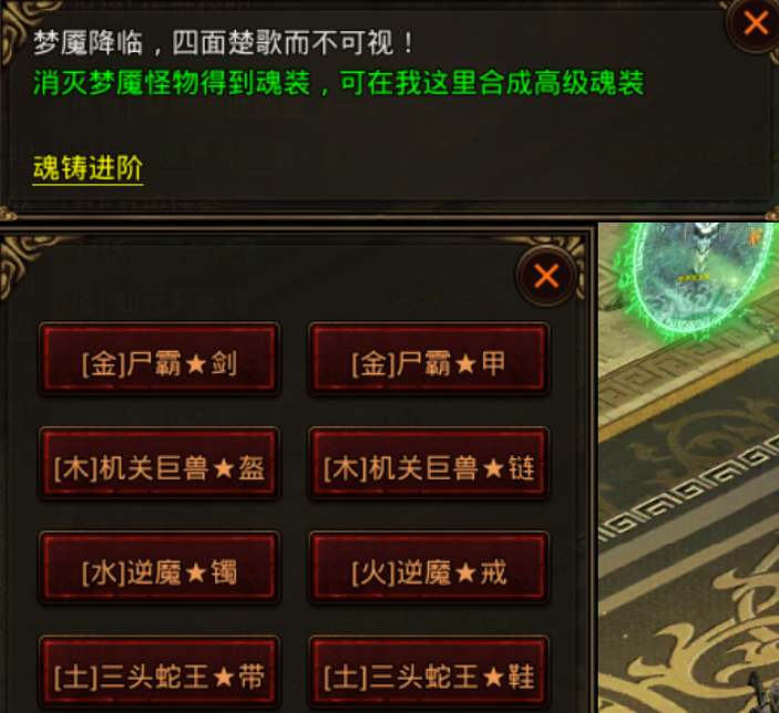 梦魇地图中的怪物拥有全新的五行属性,被击杀后会掉落可铸入部位的魂铸装备,魂铸装备同样拥有五行的独特属性,除了克制梦魇怪物,还可在PK战中起到全新的作用。