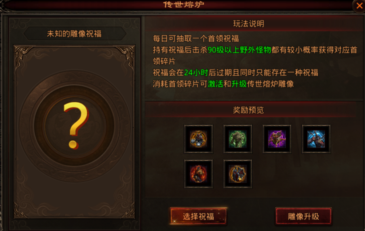 在传世世界里最为经典的六大首领:狂尸霸、机关巨兽、逆魔、禁地魔王、通天教主、铁血魔王,将会化为雕像,给勇士提供属性加成。勇士每日可通过抽卡随机获得一位魔王的祝福,在祝福期间击杀90级以上野外怪物都有几率获得该魔王的碎片。将碎片提交到对应的雕像处,即可获得属性加成。