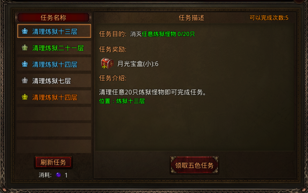 每日可完成5次五色任务,完成任务可获得月光宝盒以及密令碎片。五色任务是密令碎片的来源,五个碎片可合成一个密令随机箱,有几率获取任意密令门票。