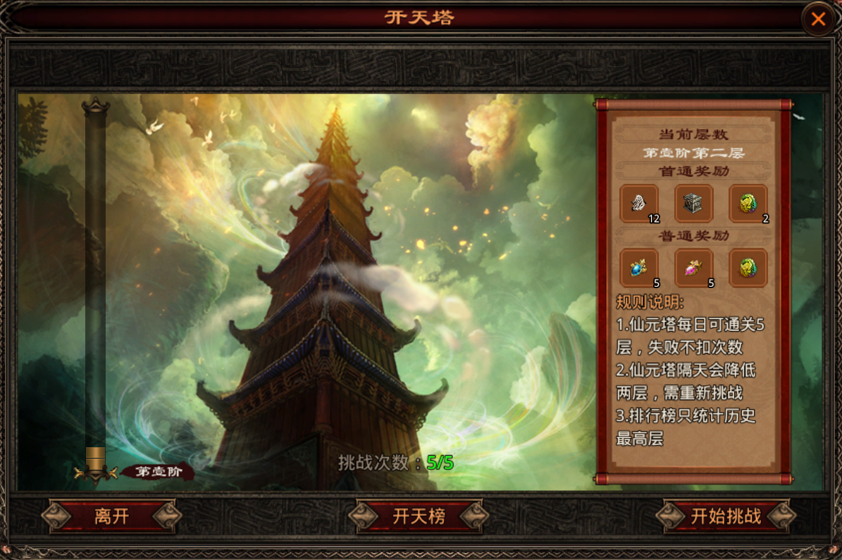 每天可通关5层,失败不扣次数,首次通关以及日常通关皆掉落升级道具。玩家爬塔楼层将会计入排行榜中。