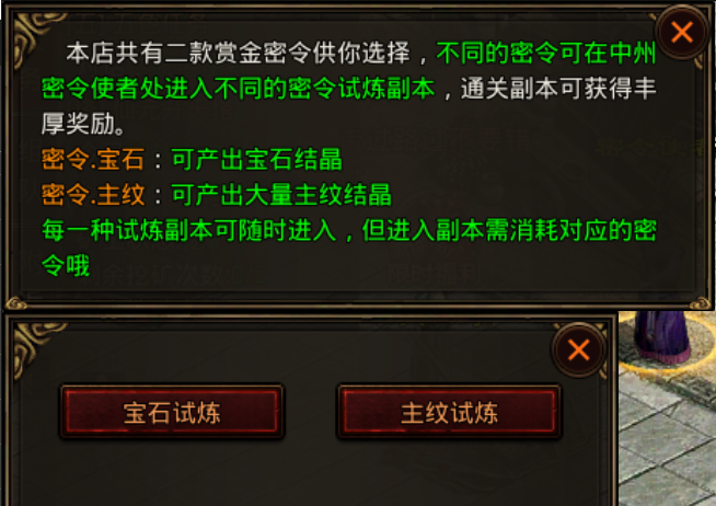 在五色任务中获取的密令碎片,合成密令后可在密令使者处进入不同的密令试炼副本,通关副本可获得相应的道具。