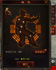 3、达到突破等级后,可以进行境界提升。境界提升需要消耗相应阶级的灵丹,灵丹可以通过击杀BOSS或商城购入,也可以通过开启赤金灵匣获得。