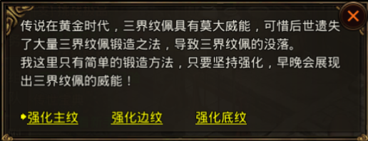 使用纹佩精华可以在铁匠-三界纹佩处对纹佩进行升级,纹佩可以通过打boss和密令试炼中获得