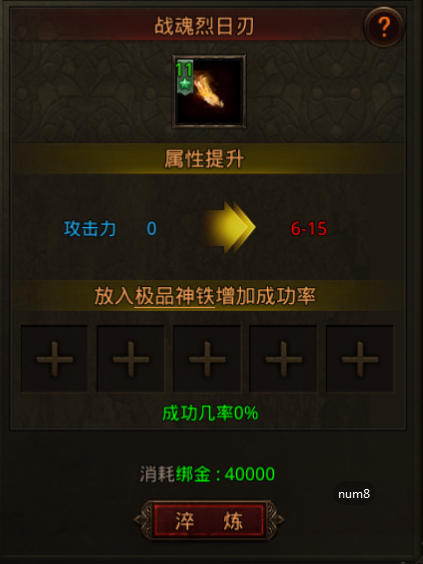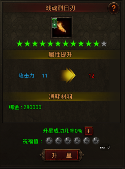 在锻造界面,花费绑金可为装备进行升星,升星可增加装备攻击属性