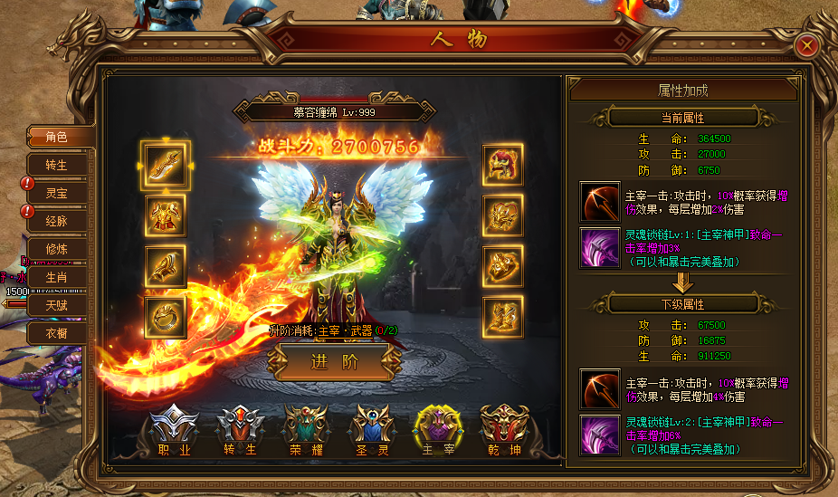 玩家可以查看自己在游戏中的角色信息,分为角色、转生、灵宝、经脉、修炼、生肖、天赋、衣橱