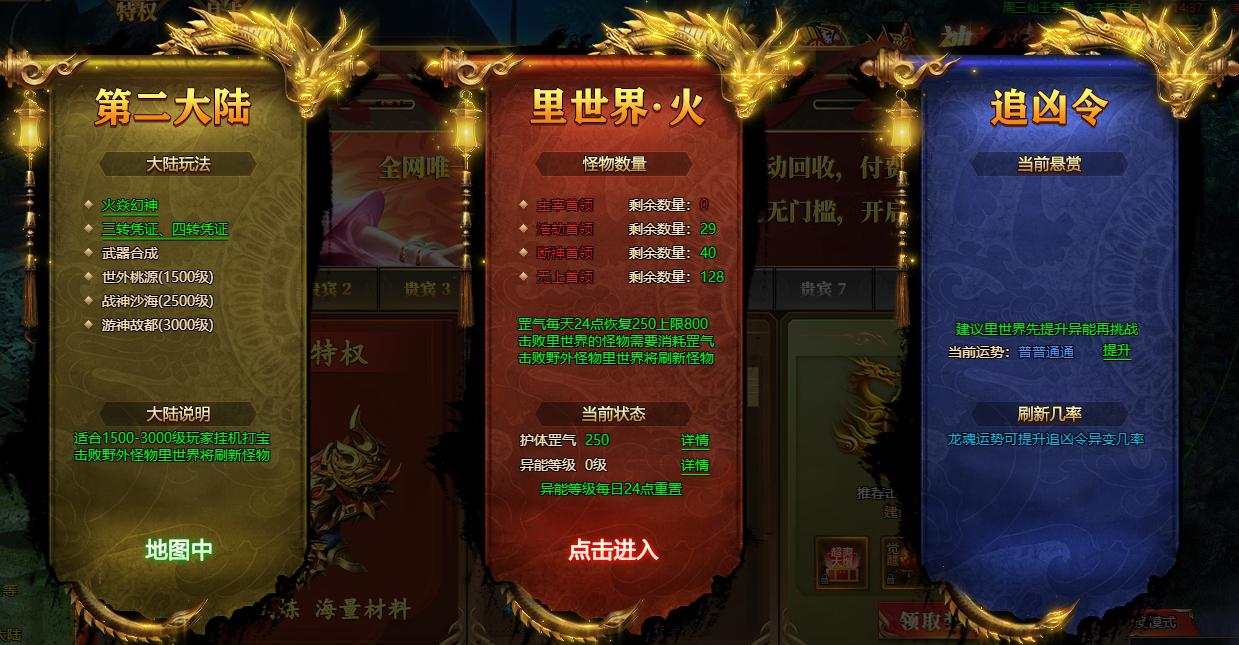 开服第一天,1100级开启功能按钮,通过技能栏上方“里世界”图标打开功能界面,