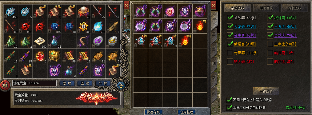 常规系统之一,玩家在游戏当中获得各式道具,都会放入”背包”,收纳玩家在游戏中获得的各种材料。玩家还可通过背包操作仓库、回收和分解功能。