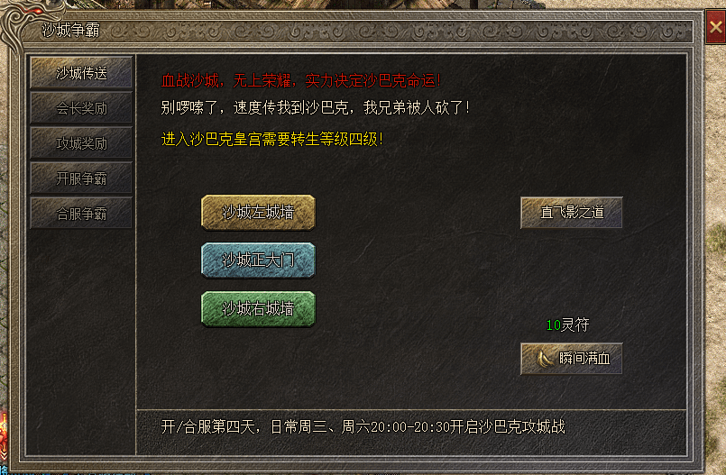 开服、合服第四天,日常周三、周六晚上8点会开启沙城争霸活动。在盟重省npc沙城争霸处可以打开此界面传送到活动现场。