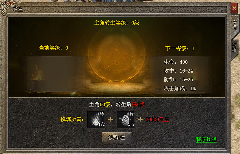 转生是游戏中一个比较重要的成长线,当角色达到一定等级,获得经验值后就不能提升等级,必须通过转生突破等级上限,转生后返回累计的经验值。玩家可以在盟重省npc人物转生处提升转生等级,不仅获得大量基础属性,解锁功能,穿戴高转装备,还能对转生低于自己的目标造成全属性压制效果。