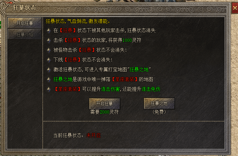 可以在盟重省npc狂暴之力处花费2000灵符开启狂暴之力,狂暴之力开启,可以大量提高主角和英雄的攻击速度、暴击几率。更有特殊称号显示,打怪概率额外提高20%。且该称号和状态不会随着死亡、下线消失。