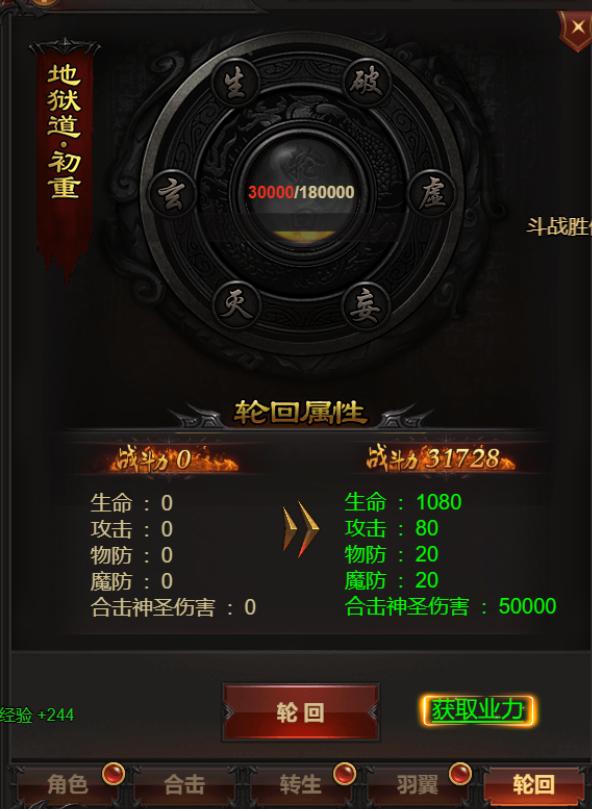 1. 轮回等级共分为12道,可通过消耗轮回丹和等级经验来进行兑换业力提升轮回等级,每提升1阶都会获得属性提升。